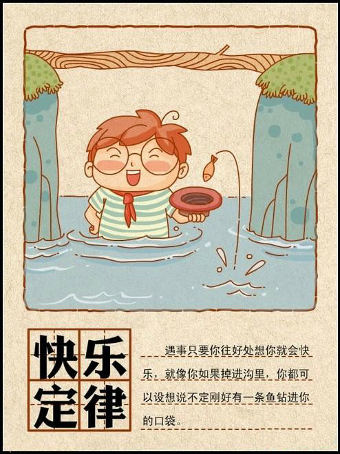遇事只要你往好處想你就會快樂,就像你如果掉進溝里,你都可以設(shè)想說不定剛好有一條魚鉆進你的口袋。