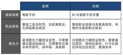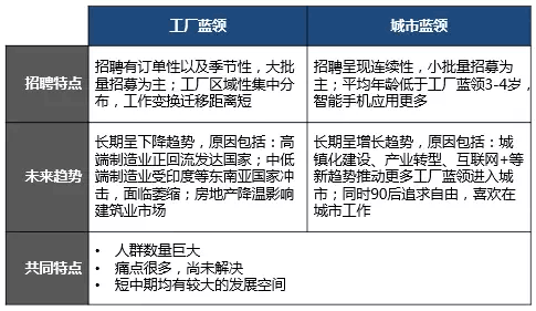 單就藍(lán)領(lǐng)群體的劃分來(lái)看,工廠藍(lán)領(lǐng)與城市藍(lán)領(lǐng)的招聘也具備不同的特點(diǎn):